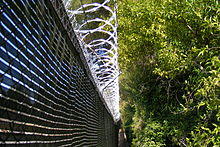 A chain-link fence (also referred to as wire netting, wire-mesh fence, chain-wire fence, cyclone fence, hurricane fence, or diamond-mesh fence) is a type of woven fence usually made from galvanized or LLDPE-coated steel wire. The wires run vertically and are bent into a zig-zag pattern so that each "zig" hooks with the wire immediately on one side and each "zag" with the wire immediately on the other. This forms the characteristic diamond pattern seen in this type of fence.