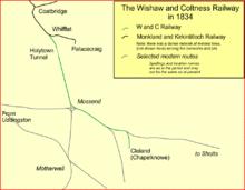 During the parliamentary process the name was changed to the Wishaw and Coltness Railway, and under that name it was incorporated by an Act of Parliament on 1 June 1829.[2] This authorised "making a railway from Chapel, in the parish of Cambusnethan, ...by Coltness and Gariongill, to join the Monkland and Kirkintilloch Railway ... in the parish of Old Monkland". Share capital was £80,000 with borrowing powers of £20,000. Tolls were laid down, and "the company may provide carriages for the conveyance of passengers, and charge for each person conveyed a rate of 4d per mile" and "locomotive engines may be used on the railway"[5][6][7]