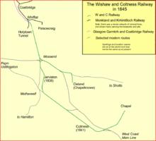 In 1845 the Wilsontown, Morningside and Coltness Railway opened its line, on 2 June.[1] The new railway sought to connect pits further east to the developing network towards the Monklands and the Clyde, and was therefore dependent on the Wishaw and Coltness Railway. The newcomer was always short of money and never succeeded to connecting the important iron works at Wilsontown, and the Inspecting Officer for passenger operation wrote that "the line terminates in a large field, about a mile from a small village called Whitburn."[11]