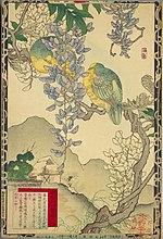 Wisteria and their racemes have been widely used in Japan throughout the centuries and were a popular symbol in family crests and heraldry.[23] One popular dance in kabuki, the Fuji Musume or "The Wisteria Maiden" is the sole extant dance of a series of five personifying dances, in which a maiden becomes the embodiment of the spirit of wisteria. In the West, both in building materials such as tile, as well as stained glass, wisterias have been used both in realism and stylistically in artistic works and industrial design.[24]