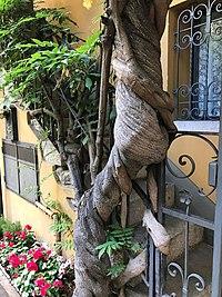 Wisterias climb by twining their stems around any available support. W. floribunda (Japanese wisteria) twines clockwise when viewed from above, while W. sinensis twines counterclockwise. This is an aid in identifying the two most common species of wisteria.[16] They can climb as high as 20 m (66 ft) above the ground and spread out 10 m (33 ft) laterally. The world's largest known wisteria is in Sierra Madre, California, measuring more than 1 acre (0.40 ha) in size and weighing 250 tons. Planted in 1894, it is of the 'Chinese lavender' variety.[17]