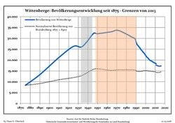 Development of population since 1875 within the current Boundaries (Blue Line: Population; Dotted Line: Comparison to Population development in Brandenburg state; Grey Background: Time of Nazi Germany; Red Background: Time of communist East Germany)