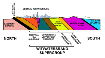 The Witwatersrand Supergroup strata which reach the surface in Johannesburg dip downwards to the south at an angle of about 30°.[2] From there on they are almost everywhere, with very few exceptions (see below), covered by younger rocks.[9] Gold mining in these buried portions of the Witwatersrand Supergroup is sometimes carried out at depths of 4 kilometres (2.5 mi) below the surface.[8][10]