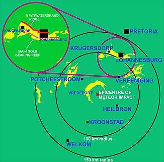 A final event that had a major impact on the geology of the Witwatersrand Basin and its exposure in the Johannesburg region, was a massive meteor impact 110 km to the south-west of Johannesburg 2020 million years ago.[2][8] The impact was close to the present village of Vredefort, which has given its name to the geological remnant of this immense event: the Vredefort Dome. Not only are the remains of this impact among the oldest on earth, but it is also one of the largest meteor impacts to have left its imprint on the earth's geology of today.[2][8] A meteor 10–15 km across created a 300 km diameter crater, distorting all the rock strata within that circle. Johannesburg is just within the outer edge of this impact crater. In the immediate vicinity of the impact all the subterranean strata were uplifted and upturned, so that Witwatersrand rocks are exposed in an arc 25 km away from the impact centre. There are unfortunately no gold deposits in these outcrops. The meteor impact, however, lowered the Witwatersrand basin inside the crater. This protected it from erosion later on; but, possibly more importantly, bringing it to the surface close to the crater rim, near Johannesburg.[8] In fact, apart from the Witwatersrand outcrops (i.e. where these rocks are exposed at the surface) in the immediate vicinity of the Vredefort Dome, virtually all the other outcrops occur in an arc approximately 80–120 km from the centre of the impact crater, to the west, north-west, north and north-east.[9] Thus, it is possible that if it had not been for the Vredefort meteor strike 2000 million years ago, we would either have never discovered the rich gold deposits beneath the Southern African surface, or they would have been eroded away during the uninterrupted removal of a several kilometres thick layer of deposits from the surface of the Southern African Plateau in the relatively recent geological past: i.e. the past 150 million years, but especially during the last 20 million years.[8]
