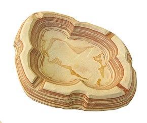 There was no free oxygen in earth's atmosphere until about 2000 million years ago, before the appearance and sufficient development of photosynthesizing cyanobacteria.[12] The oxygen produced by these microorganisms rapidly reacted with, amongst others, Fe2+ ions dissolved in water, precipitating insoluble red iron oxide (hematite). For various reasons, the sedimentation of the fine grain mud was affected by cyclic episodes with more or less precipitation of iron oxides. The result was alternating red and beige layers of mud which, when consolidated, became banded ironstones.[12]