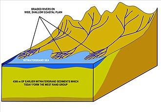 The Witwatersrand basin was created during the Archean Eon, and is therefore amongst the oldest geological structures on earth. It was laid down in two stages, over the course of 260 million years starting just short of 3000 million years ago. The first phase, lasting 60 million years, consisted of sedimentary deposits in a shallow sea, conveniently named the “Witwatersrand Sea”. The resulting 2500–4500 m thick layer of sediments is termed the “West Rand Group” of Witwatersrand rocks. The second phase, which lasted for 200 million years, followed on from the first phase, with on-land deposits, resulting from the retreat of the Witwatersrand Sea, leaving a wide almost flat coastal plain over which rivers from the north formed wide braided river deltas, into some of which rich deposits of gold were deposited. The resulting 2500 m thick layer of rock is termed the “Central Rand Group”. The “West Rand Group” and “Central Rand Group” of rocks together form the “Witwatersrand Supergroup”, the full horizontal extent of which is termed the Witwatersrand Basin.[2][8][1]