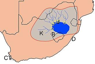 The Witwatersrand plateau forms a continental divide, with the run-off to the north draining into the Indian Ocean via the Crocodile and Limpopo rivers, while the run-off to the south drains via the Vaal into the Orange River and ultimately into the Atlantic Ocean.[2][6][7]