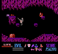 Players use the control pad to move horizontally and to crouch. Kuros can attack enemies by using his Brightsword or with other weapons and magic.[4] He can attack enemies while in the air or while standing by holding the sword in position.[1] The objective of the game is to collect the various weapons and magic as well as the gems and treasure along the way; players use these items to make it past the enemies and other obstacles and hazards. Players collect gems in order to "bribe" the creature who guards the entrance to the next level; if players do not have enough gems, they cannot progress to the next level.[5][6] At the end of each level is a boss creature that has been empowered by Malkil's black magic. Bosses have an "Enemy's Black Magic Power" meter that shows how difficult the boss is, how many hits are required to defeat it, and what type of weaponry needs to be used.[7] Kuros has a life meter that decreases as time passes and when he sustains damage from enemies. Players loses a life when Kuros' life meter runs out, but upon restarting they keep all the items they have obtained up to that point. The game ends when all three lives have been lost, but players have the choice to continue and restart at the level in which they lost their last life; upon continuing, players keep all their items obtained up to that point, but their score goes back to zero. Along the way, players can replenish Kuros' life meter by collecting pieces of meat scattered throughout the levels.[8]