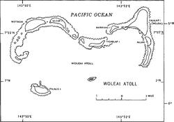 Woleai, also known as Oleai,[1] is a coral atoll of twenty-two islands in the eastern Caroline Islands in the Pacific Ocean, and forms a legislative district in the Yap State in the Federated States of Micronesia and is located approximately 57 kilometres (35 mi) west-northwest of Ifalik and 108 kilometres (67 mi) northeast of Eauripik. Woleai is also the name of the largest of the islets constituting the atoll, lying to the northeast.