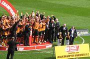 Lifelong fan Jack Hayward purchased the club in 1990 and immediately funded the extensive redevelopment of dilapidated Molineux into a modern all-seater stadium.[36] With work completed in 1993, Hayward redirected his investment onto the playing side in an attempt to win promotion to the newly formed Premier League. Despite substantial spending, neither Graham Taylor nor Mark McGhee could fulfil this, both managers leading the team to play-off defeats at the semi-final stages in 1995 and 1997 respectively. It was not until 2003 that Wolves were promoted, when they defeated Sheffield United 3–0 in the play-off final under Dave Jones to end a 19-year absence from the top level.[37] Their stay proved short-lived however as they were immediately relegated back to the newly retitled EFL Championship.
