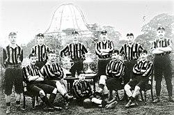 In the 2000 edition of "The Rough Guide to English Football", the history section on the Wolves page begins: "The very name Wolves thunders from the pages of English football history".[4] As with several other clubs, Everton for example, Wolves had humble beginnings shaped by the twin influences of cricket and the church. The club was founded in 1877 as St. Luke's F.C. by John Baynton and John Brodie, two pupils of St Luke's Church School in Blakenhall, who had been presented with a football by their headmaster Harry Barcroft.[5] The team played its first-ever game on 13 January 1877 against a reserve side from Stafford Road, later merging with the football section of a local cricket club called Blakenhall Wanderers to form Wolverhampton Wanderers in August 1879.[4][5] Having initially played on two strips of land in the town, they relocated to a more substantial venue on Dudley Road in 1881, before lifting their first trophy in 1884 when they won the Wrekin Cup, during a season in which they played their first-ever FA Cup tie.[5] Having become professional, the club were nominated to become one of the twelve founder members of the Football League in 1888,[6] in which they played in the first round of Football League fixtures ever staged, against Aston Villa on 8 September 1888.[7] They ended the inaugural season in third place, as well as reaching their first FA Cup Final, losing 0–3 to the first "Double" winners, Preston North End. At the conclusion of the campaign the club relocated for a final time when they moved to Molineux, then a pleasure park known as the Molineux Grounds.[5]