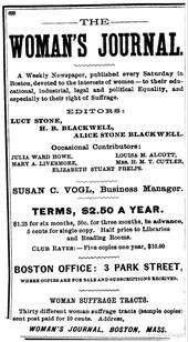 The first issue was published on January 8, on the two-year anniversary of the first issue of Susan B. Anthony's The Revolution. Stone and Blackwell served as editors, with assistance from Livermore. Julia Ward Howe edited from 1872 to 1879. Alice Stone Blackwell, daughter of Stone and Blackwell, began editing in 1883 and took over as sole editor after her father's death in 1909, continuing until 1917. Contributors included Antoinette Brown Blackwell, Mary Johnston, Stephen S. Wise, Zona Gale, Florence Kelley, Witter Bynner, Ben B. Lindsey, Louisa May Alcott, Harriet Clisby and Caroline Bartlett Crane. William Lloyd Garrison was a frequent contributor. Around 1887, headquarters were located in Boston on Park Street.[1]