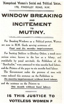 The tactics of the WSPU included shouting down speakers, hunger strikes, stone-throwing, window-smashing, and arson of unoccupied churches and country houses. In Belfast, when in 1914 the Ulster Unionist Council appeared to renege on an earlier commitment to women's suffrage,[20] the WSPU's Dorothy Evans (a friend of the Pankhursts) declared an end to "the truce we have held in Ulster." In the months that followed WSPU militants (including Elizabeth Bell, the first woman in Ireland to qualify as a doctor and gynaecologist) were implicated in a series of arson attacks on Unionist-owned buildings and on male recreational and sports facilities.[21] In July 1914, in a plan hatched with Evans, Lillian Metge, who was previously part of a 200-strong deputation that charged George V as he entered Buckingham Palace, bombed Lisburn Cathedral.[22]