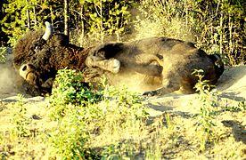 As above-mentioned, "wood bison" in the park are hybrid descendants between outnumbering, disease-infected plains bison translocated from Buffalo National Park into Wood Buffalo National Park in 1920s.[30] However, a study in 1995 detected that there have been notable differences in morphology among each herds within the park, showing different degrees of hybridization. The herd at the Sweetgrass Station nearby Peace–Athabasca Delta, followed by Slave River Lowlands herd, preserves relatively loyal phenotype to the original wood bison before 1920s, even surpassing the preserved herds at Elk Island National Park and Mackenzie Bison Sanctuary.[31]