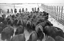 Despite protests from biologists, nearly 6,700 plains bison were introduced from Buffalo National Park, to avoid unwanted mass culling due to over-population, by the Government of Canada between 1925 and 1928,[11] where they hybridized with the local 1,500-2,000 wood bison, as well as introducing bovine tuberculosis and brucellosis diseases into the herd.[12] Parks officials have since that time attempted to undo this damage with successive culls of diseased animals. In 1957, however, a disease-free, relatively pure wood bison herd of 200 was discovered near Nyarling river. In 1965, 23 of these bison were relocated to the south side of Elk Island National Park and 300 remain there today as the most genetically pure wood bison remaining. Between 1951 and 1967, 4000 bison were killed and 2,000,000 pounds (910 t) of meat were sold from a special abattoir built at Hay Camp. These smaller culls did not eradicate the diseases, however, and in 1990 a plan was announced to cull the entire herd and restock it with undiseased animals from Elk Island National Park.[13] This plan was abandoned due to a negative public reaction to the announcement.[12] Since that time, wolves, the bison's main predator, have recovered in numbers due to a reduction in control efforts (mostly poisoning), reducing the size of the herd.