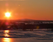 Wood County spans two of Wisconsin's five geographical regions. The northern part of the county is in the Northern Highlands, with mostly rich cropland with heavy clay soil, used for corn, soybeans, hay and dairy.[6] In the northwest corner the Marshfield moraine runs from Marathon County through Marshfield, Bakerville and Nasonville into Clark County.[7] The south and central areas from Babcock through Cranmoor and Wisconsin Rapids are in the Central Plain, flat and marshy - one of the major cranberry-producing centers of the United States.[6] The Wisconsin River cuts across the southeast corner, a corridor of sand flats, islands and oxbows. The river falls about 120 feet as it flows through the county,[8][9] driving several power dams. The remainder of the county is drained by smaller streams and rivers, punctuated by isolated hills like Powers Bluff.