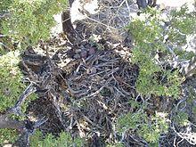 Each species of pack rat is generally restricted to a given type of habitat within its range. Pack rats live anywhere from low, hot, dry deserts to cold, rocky slopes above timberline. Pack rats build complex houses or dens made of twigs, cactus joints, and other materials. These contain several nest chambers, food caches, and debris piles. Dens are often built in small caves or rocky crevices, but when close by human habitations, woodrats will opportunistically move into the attics and walls of houses. Some Neotoma species, such as the white-throated woodrat (N. albigula), use the bases of prickly pear or cholla cactus as the sites for their homes, using the cactus' spines for protection from predators. Others, like the desert woodrat (N. lepida) will build dens around the base of a yucca or cactus, such as jumping and teddy-bear chollas. The largest species, Neotoma cinerea, has a bushy, almost squirrel-like tail. Bushy-tailed woodrats Neotoma cinerea occupy a range of habitats from boreal woodlands to deserts. They are cliff-dwellers and are often found on isolated, high-elevation exposed boulder areas under a variety of temperature and moisture conditions.[5] They require adequate shelter among the rocks, though they are occasionally found inhabiting abandoned buildings as well.