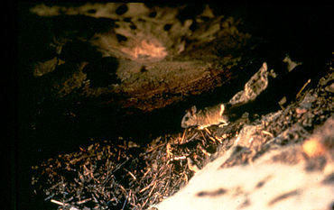 In the absence of rock crevices or caves, the dens are often built under trees or bushes. The pack rats will also use plant fragments, animal dung, and small rocks in building the den. The vast majority of the materials will be from a radius of several dozen yards of the nest. Woodrats often urinate on the debris piles; sugar and other substances in the urine crystallize as it dries out, creating a material known as amberat,[11] which under some conditions can cement the midden together, and can encase plant fragments, pellets and other debris in an amber-like matrix. The resilience of the middens is aided by three factors. The crystallized urine dramatically slows the decay of the materials in the midden; the dry climate of the American Southwest further slows the decay; and middens protected from the elements under rock overhangs or in caves survive longer.