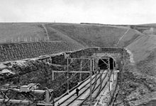 The line of the railway was marked over the ridge and five vertical shafts were sunk.[1] From the shaft bases, a horizontal drift was driven along the line. Although sufficient land had been purchased for the construction of a pair of tunnels, it was decided that only one would be built.[1] The tunnel's bore passed through ground largely composed of Millstone Grit interspersed with argillaceous shale and softer sandstone on a gradient of 1 in 201, rising toward the east.[1] Wires were suspended down each shaft from which the centre line was determined by means of a theodolite. The accuracy was such that the drifts lined up with less than three inches of error.