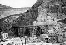 The western portals of the Woodhead tunnels in 1953. On the left, a train emerges from one of the original tunnels, whilst tunnel 3 is under construction on the right. | |