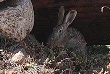 The woolly hare is a shy and usually solitary animal, and although sometimes active by day, it is mostly nocturnal. It feeds on grasses and herbs, with individual animals returning regularly at night to the same foraging areas. During the day it sometimes rests in the sun in a sheltered position. The breeding season starts in April, with two litters of between four and six young being produced each year.[3]