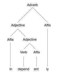- ^ The existence of words like appendix and pending in English does not mean that the English word depend is analyzed into a derivational prefix de- and a root pend. While all those were indeed once related to each other by morphological rules, that was only the case in Latin, not in English. English borrowed such words from French and Latin but not the morphological rules that allowed Latin speakers to combine de- and the verb pendere 'to hang' into the derivative dependere.