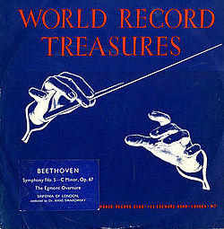 World Record issues were certainly in production by mid-1956. The World Record Treasures records were promoted[1] as a series from which 'members' (membership was free) were required to select a given number of purchases per year. These were sold at lower prices than usual (21s 6d, equivalent to £1.071&fras1;2) and distributed in cheap wrappers (originally logo-printed Fablothene, and then card covers with stickers naming the selection). A monthly Club magazine (Record Review) was launched in late 1956, featuring the existing artists and recordings and announcing future selections.[2] The company was first based at 125 Edgware Road, London, with a display centre at 49 Edgware Road.[3] The main UK rival in similar business was the Concert Hall label.