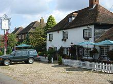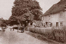 The countryside around the village has been described as "an area where the whole landscape is a piece of history—a valley where time has stood still and the pattern of woods and fields is much as it was 500 years ago".[22] A designated ancient woodland lies to the north-west of the village.[48] Predominantly centred on Barrows Wood but also including High Wood and Trundle Wood, this is likely a remnant of the woodland described by Hasted: "... at the northern boundary of the parish there is a considerable quantity of wood, consisting mostly of hazel and oak, with numbers of trees of the latter, interspersed among them, which are but small, never here growing to any size."[18] An ancient track that passes through the remnants of this woodland has been damaged by the use of off-road vehicles leading to attempts by local landowners to block Drake Lane, a byway that runs through Drake Lane Wood in the south-west of the parish and which may have been used by recruits of Sir Francis Drake's navy.[22][49] Deep water-logged ruts in the track have resulted in the partial resurfacing of the route.[50]