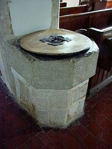 The church, parts of which date back to the Norman era, is dedicated to Saint Giles and forms part of the united benefice of Tunstall and Bredgar, along with the villages of Rodmersham, Milstead, Bicknor and Frinsted. The ecclesiastical parish of Wormshill is in the Diocese of Canterbury and the Sittingbourne deanery (within the archdeaconry of Maidstone).[39][84] As of March 2018, the rector was the Reverend Alan Pinnegar.[85] In 1995, the church received a new ring of six bells after a campaign by villagers begun in 1944 by Michael Nightingale of Cromarty, who at age 16 opened a savings account with 10 shillings for the restoration of the church's bells. Fifty years later, he completed the full ring of six bells: one of the six was original, and the other five were rescued from abandoned churches.[86][87] The last major renovations of the church occurred in 1789 and 1901.[39][88] Of note within the church are a Norman font and Tudor pulpit.[39] The church also contains a 13th century chest, first discovered in the early 20th century.[89][90][91] The former rectory is now a private dwelling.