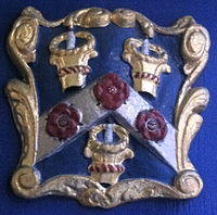 - Shield: Azure on a Chevron Argent three Roses Gules seeded Or between three Mortars royal Or. (A mortar is a type of candle-holder, similar to the mortar of a pestle-and-mortar; a mortar royal is particularly splendid.)