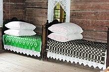 A woven coverlet or coverlid (derived from Cat. cobre-lit[1]) is a type of bed covering with a woven design in colored wool yarn on a background of natural linen or cotton. Coverlets were woven in almost every community in the United States from the colonial era until the late 19th century.[2]