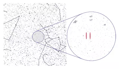 The galactic coordinates for the positive horn are l=11.7°, b=−18.9°, and for the negative horn l=11.9°, b=−19.5°, both being therefore about 19° toward the southeast of the galactic plane, and about 24° or 25° east of the galactic centre. The region of the sky in question lies northwest of the globular cluster M55, in the constellation Sagittarius, roughly 2.5 degrees south of the fifth-magnitude star group Chi Sagittarii, and about 3.5 degrees south of the plane of the ecliptic. The closest easily visible star is Tau Sagittarii.[14]
