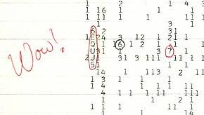 By 1977, Ehman was working at the SETI project as a volunteer; his job involved analyzing by hand large amounts of data processed by an IBM 1130 computer and recorded on line printer paper. While perusing data collected on August 15 at 22:16 EDT (02:16 UTC), he spotted a series of values of signal intensity and frequency that left him and his colleagues astonished.[4] The event was later documented in technical detail by the observatory's director.[5]