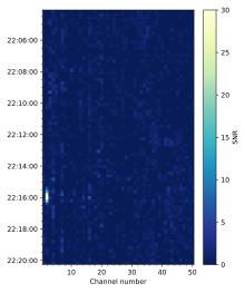 The signal intensity was measured as signal-to-noise ratio, with the noise (or baseline) averaged over the previous few minutes. The signal was sampled for 10 seconds and then processed by the computer, which took 2 seconds. Therefore, every 12 seconds the result for each frequency channel was output on the printout as a single character, representing the 10-second average intensity, minus the baseline, expressed as a dimensionless multiple of the signal's standard deviation.[8]