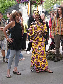The kaftan is always worn with a headscarf or head tie. During a wedding ceremony, the bride's kaftan is the same color as the groom's dashiki. The traditional color for West African weddings is white.[14] The most popular non-traditional color is purple or lavender, the color of African royalty.[15] Blue, the color of love, is also a common non-traditional color.[16] Most women wear black kaftans to funerals.[17] However, in some parts of Ghana and the United States, some women wear black-and-white prints, or black and red. The kaftan is the most popular attire for women of African descent throughout the African diaspora. African and African-American women wear a wide variety of dresses, and skirt sets made out of formal fabrics as formal wear. However, the kaftan and wrapper are the two traditional choices. It is not uncommon for a woman to wear a white wedding dress when the groom wears African attire. In the United States, African-American women wear the boubou for special occasions. The kaftan or boubou is worn at weddings; funerals; graduations; and Kwanzaa celebrations.