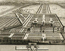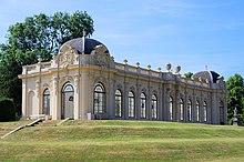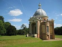 The park is divided by a wide gravel central walk, continued as a long canal that leads to a Baroque pavilion banqueting house designed by Thomas Archer and completed in 1711.[8] The garden designer Batty Langley was employed in the 1730s.[9] The interior of the pavilion is decorated with an impressive Ionic columns in trompe-l'œil. Boundary canals were altered to take the more natural shape by Capability Brown, who worked there between 1758 and 1760, and who also ringed the central formal area with a canal and woodland. The gardens and garden houses were mapped by John Rocque in 1735.[10] During the later 18th and 19th centuries,[9] an orangery and marble fountains were added. The Bathhouse (sometimes referrred to as a Roman bath, a hermitage and a grotto) was built, and its grounds laid out, between about 1769 and 1772.[9][11]