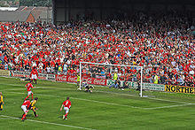 Wrexham Association Football Club (Welsh: Clwb Pêl-droed Cymdeithas Wrecsam) is a Welsh professional association football club based in Wrexham, Wales. The team compete in the National League, the fifth tier of the English football league system. Formed in 1864,[3] they are the oldest club in Wales and the third oldest professional football team in the world.[4] Wrexham's home stadium, the Racecourse Ground, is the world's oldest international stadium that still continues to host international games.[5] The record attendance at the ground was set in 1957, when the club hosted a match against Manchester United in front of 34,445 spectators.[6]