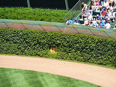Under the ground rules of Wrigley Field, if a baseball gets into the ivy and gets stuck, the batter is awarded a ground rule double. Outfielders often raise their arms up when the ball goes into the ivy, signaling to an umpire to go out and rule on the play.[44] However, if the ball becomes dislodged or the fielder reaches into the vines to try and get the ball, it is considered in play and the runners can advance.[45]