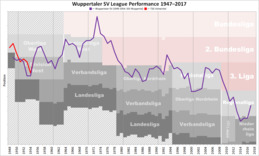 After the 1975 relegation from the Bundesliga, Wuppertal next played five seasons in the second tier 2. Bundesliga until 1980. From 1980 the played a dozen seasons in the Amateur Oberliga Nordrhein (III). A series of strong finishes in the late 80s eventually led to a return to the 2. Bundesliga for the 1992–93 and 1993–94 seasons before relegation once again to third tier football in the Regionalliga West/Südwest.