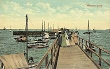 Aboriginal men from Black's Camp helped build the original Wynnum jetty in the 1850s, and in 1886, three local Aboriginal men, 'Johnny Murray, Tommy Nuggin and Sam', saved three European women from drowning in Wynnum Creek.[8] Local Aboriginal people also ran fishing, oyster-catching and turtle hunting enterprises from Wynnum into the early 1900s, with these tours advertised in Brisbane's newspapers.[4] There were some tensions with the European newcomers, including an unprovoked attack by local ruffians on the Aboriginal camp in Wynnum in 1884.[9] Well known Jagera chief 'King Sandy' Kerwalli (aka Gairballie) died at Black's Camp in 1900.[10]