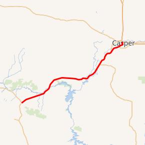 Wyoming Highway 220 begins its western end in Carbon County at US 287/WYO 789 at Muddy Gap Junction and from there heads northeast toward Casper.[1] Nearing 20 miles, Highway 220 leaves Carbon County and enters Natrona County as it nears the north side of the Pathfinder Reservoir and the Pathfinder National Wildlife Refuge.[2] WYO 220 passes north of the reservoir, now traveling more easterly as it comes upon the census-designated place (CDP) of Alcova, the center of population of Wyoming. Also to the south lies Alcova Lake. Past Alcova, WYO 220 turns back northeast and begins to parallel the North Platte River and continue until it reaches Casper. At 53.17 miles the northern terminus of Wyoming Highway 487 is intersected as 220 continues northeast.[2] Just before entering the Casper city limits, the two-lane highway becomes a divided multi-lane highway with two lanes for each direction of traffic, and becomes known as CY Avenue. Wyoming Highway 258 (Wyoming Boulevard) is intersected at just over 69 miles. Past WYO 258, the multi-lane division continues until just before the intersection of CY Avenue and Poplar Street. At this intersection, WYO 220 follows Poplar Street north.[2] As WYO 220 heads north on Poplar Avenue, US 20 Business/US 26 Business (First Street) is intersected within a mile and three-quarters of a mile later, WYO 220 reaches its eastern end at Interstate 25 (exit 188B) which also carries US 20/US 26/US 87 as well.