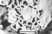 It has been suggested that the mysterious vendozoans of the Ediacaran period represent fossil xenophyophores.[31] However, the discovery of C27 sterols associated with the fossils of Dickinsonia cast doubt on this identification, as these sterols are today associated only with animals. These researchers suggest that Dickinsonia and relatives are instead stem-bilaterians.[32] Other ediacaran fossils, such as Palaeopascichnus Intrites, Yelovichnus, and Neonereites have been posited as fossil xenophyophores and linked to the Eocene fossil Benkovacina. However, analysis of the latter found neither barite crystals nor evidence of agglutinated foraminifera in the wall.[33][34] A 2011 study that examined growth and development of Palaeopascichnus concluded it was likely not a xenophyophore.[16] A 2014 study of Pteridinum reached similar conclusions.[35]