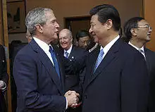 Xi was appointed to the nine-man Politburo Standing Committee of the Communist Party of China at the 17th Party Congress in October 2007. He was ranked above Li Keqiang, an indication that he was going to succeed Hu Jintao as China's next leader. In addition, Xi also held the first secretary of the Communist Party's Central Secretariat. This assessment was further supported at the 11th National People's Congress in March 2008, when Xi was elected as vice-president of the People's Republic of China.[60] Following his elevation, Xi has held a broad range of portfolios. He was put in charge of the comprehensive preparations for the 2008 Summer Olympics in Beijing, as well as being the central government's leading figure in Hong Kong and Macau affairs. In addition, he also became the new president of the Central Party School of the Communist Party of China, the cadre-training and ideological education wing of the Communist Party. In the wake of the 2008 Sichuan earthquake, Xi visited disaster areas in Shaanxi and Gansu. He made his first foreign trip as vice president to North Korea, Mongolia, Saudi Arabia, Qatar and Yemen from 17 to 25 June 2008.[61] After the Olympics, Xi was assigned the post of committee chair for the preparations of the 60th Anniversary Celebrations of the founding of the People's Republic of China. He was also reportedly at the helm of a top-level Communist Party committee dubbed the 6521 Project, which was charged with ensuring social stability during a series of politically sensitive anniversaries in 2009.[62]