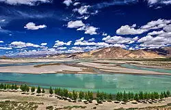 The South Tibet Valley is formed by the Yarlung Tsangpo River during its middle reaches, where it travels from west to east. The valley is approximately 1,200 km (750 mi) long and 300 km (190 mi) wide. The valley descends from 4,500 m (14,760 ft) above sea level to 2,800 m (9,190 ft). The mountains on either side of the valley are usually around 5,000 m (16,400 ft) high.[14][15] Lakes here include Lake Paiku and Lake Puma Yumco.