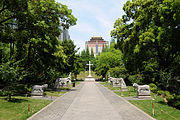 The other notable park in Xujiahui is Guangqi Park, which features the tomb of Xu Guangqi, after whom the area and district are ultimately named. The tomb, recently restored according to its original set-up, is a curious combination of a large Christian cross as the grave marker, with a traditional Chinese "spirit way" lined with stone animals. Also located in the park is a traditional house relocated here as a result of urban redevelopment elsewhere in the district.