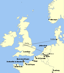 The first of these new Knickebein transmitters was set up in 1939 on Stollberg hill in Nordfriesland near the border with Denmark, at Kleve (Cleves) near the Dutch border, almost the most westerly point in Germany, and at Lörrach near the border with France and Switzerland in south-western Germany.[7][8] Following the fall of France in June 1940, additional transmitters were installed on the French coast. Stations were also constructed in Norway and the Netherlands.[9][10]