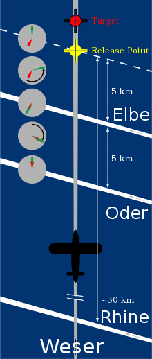 The "cross" signal in X-Gerät used a series of three very narrow single beams, Rhine, Oder and Elbe. They were carefully aimed to define a precise bomb release trajectory.[23] First a bomb release point along Weser was determined, by calculating the range or distance the bombs would travel between release and impact, and picking a point at that range to target. The Elbe beam intersected Weser 5 kilometres (3.1 mi) before the release point. The Oder beam intersected Weser 10 kilometres (6.2 mi) before the release point, or 5 kilometres (3.1 mi) before Elbe. Rhine did not require the same precision and was approximately 30 kilometres (18.6 mi) before the release point. The beams' width added a small error to the intersection coordinates, on the order of tens to hundreds of meters.