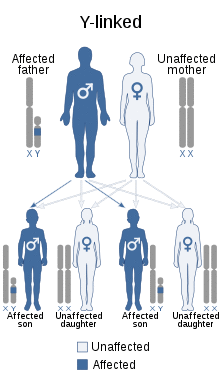 Y linkage, also known as holandric inheritance (from Ancient Greek ὅλος hólos, "whole" + ἀνδρός andrós, "male"),[1] describes traits that are produced by genes located on the Y chromosome. It is a form of sex linkage.