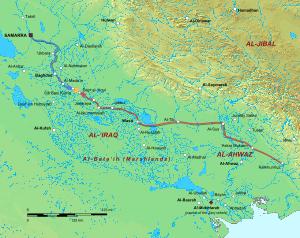 Ya'qub traveled through Khuzistan, during which he gained the defection of a former general of the caliph's, Abi'l-Saj Devdad, and entered Iraq. The caliphal general Masrur al-Balkhi managed to slow down his progress by flooding the land outside Wasit, but the Saffarid army was able to get through this and he entered Wasit on 24 March. Leaving Wasit, he set out for the town of Dayr al-`Aqul, which was about fifty miles from Baghdad.[26][27][28][29] According to one source, Ya'qub did not actually expect the caliph to offer battle; instead he would give in to any demands that the Saffarid had.[30][31] Al-Mu'tamid, however, sent al-Muwaffaq to stop him. The two armies met at Istarband, between Dayr al-`Aqul and Sib Bani Kuma.[32][33][34][35]