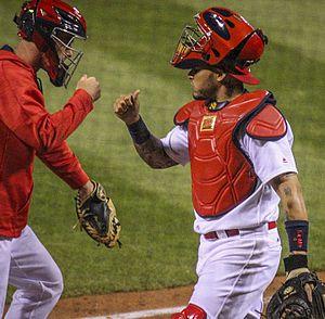 The Cardinals squared off against the Pirates in the NLDS. Two weeks removed from just missing a no-hitter, Wacha again nearly repeated the feat with Molina behind the plate in an elimination game, Game 4. Molina threw out pinch runner Josh Harrison attempting to steal second base in the eighth inning to help the Cardinals preserve a 2–1 lead.[108] In the World Series against the Boston Red Sox, Molina became just the ninth player – and the first in the expansion era – in franchise history to appear in four World Series with the club, and the first since Stan Musial in the 1946 World Series, also against the Red Sox.[109] Molina collected more awards following the season, including his first Silver Slugger Award,[110] sixth Gold Glove, and a third-place finish in MVP voting.[111] Molina was a co-winner, along with Wainwright and Matt Carpenter, for the BBWAA St. Louis Baseball Man of the Year.[39]